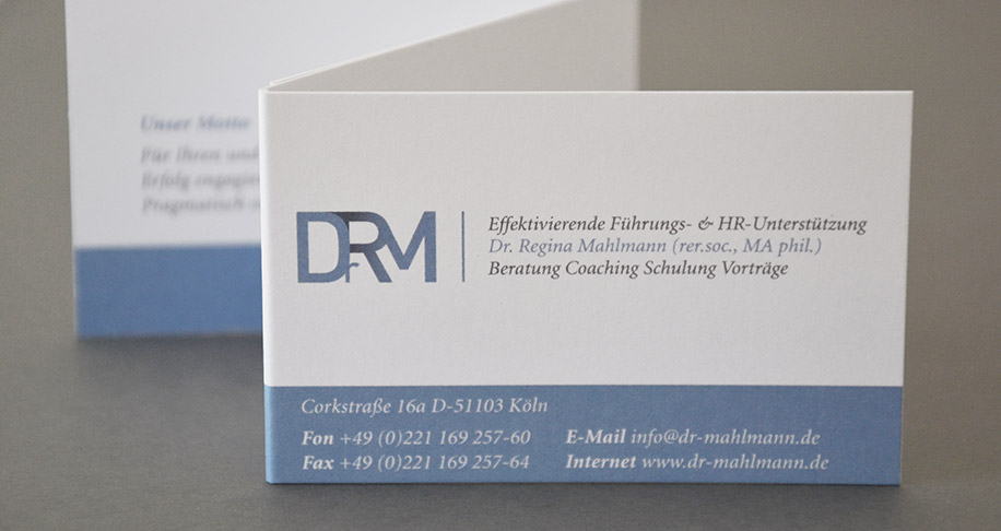 Das Gestaltungsbüro entwickelte eine typografische Wort-Bildmarke, welche die Initialen der Frau Dr. Regina Mahlmann ganz prägnant in den Vordergrund stellt. Unterstützt durch eine Serifenschrift wird die strenge Bildmarke aufgebrochen.