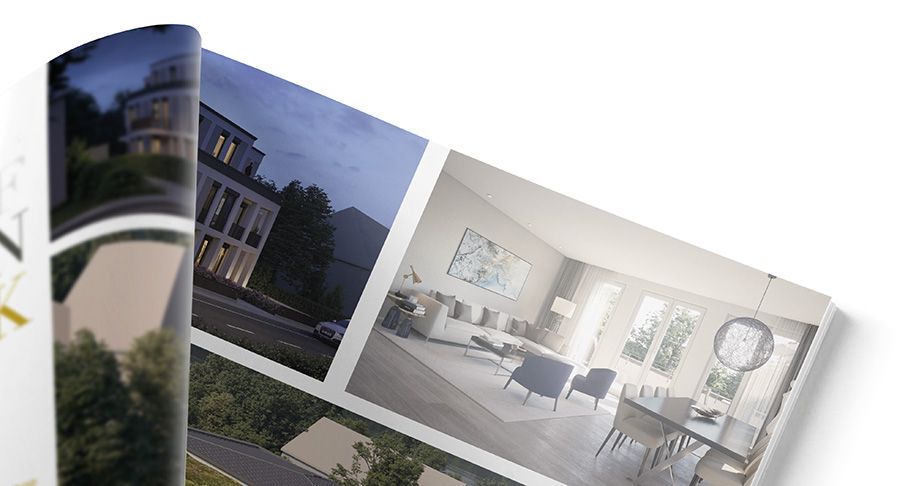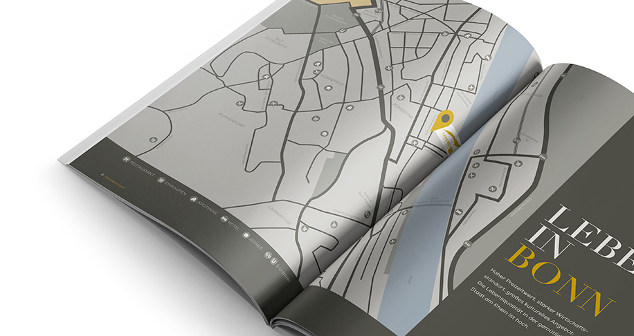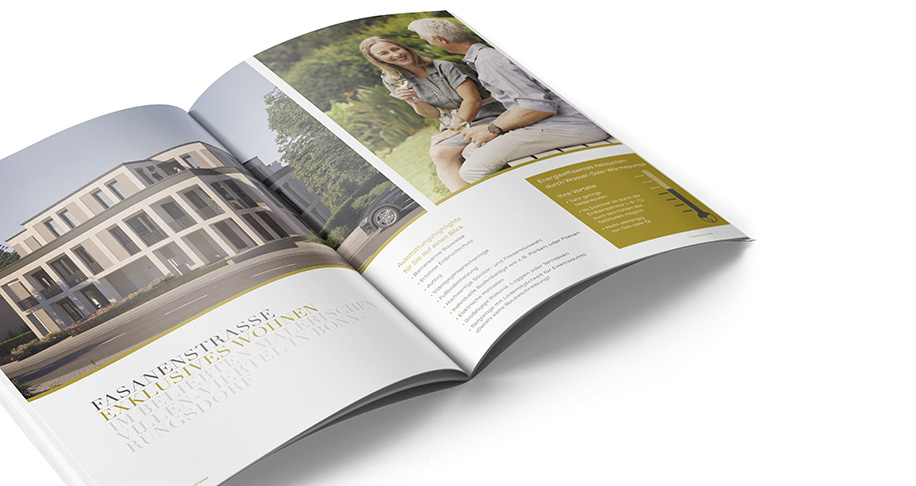 Die S Corpus Immobilienmakler GmbH ist der führende Anbieter im Rheinland und rangiert deutschlandweit seit Jahren unter den Top-Immobilienvermittlern. Jedes Jahr vertrauen mehrere Tausend private und gewerbliche Kunden dem Immobilien-Experten der Sparkasse KölnBonn, Immobilien für sie zu finden oder zu vermarkten. Für ein Bauprojekt in Bonn Rüngsdorf entwickelte das Gestaltungsbüro eine passende Verkaufsbroschüre, die aufgrund der exklusiven Immobilie mit Vollton Gold veredelt wurde.