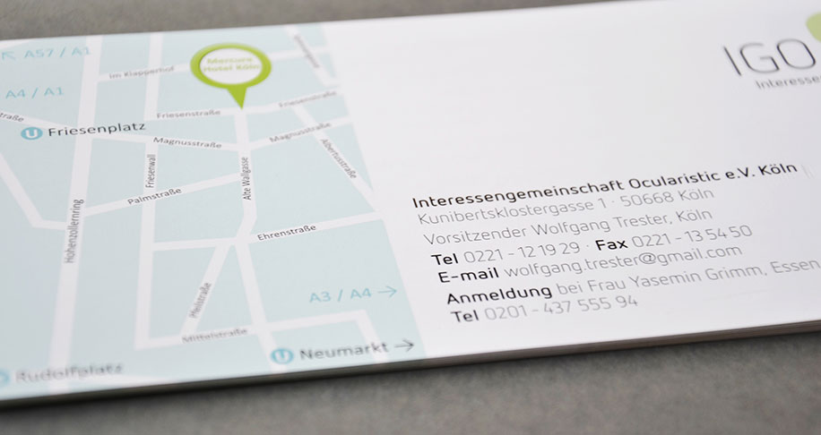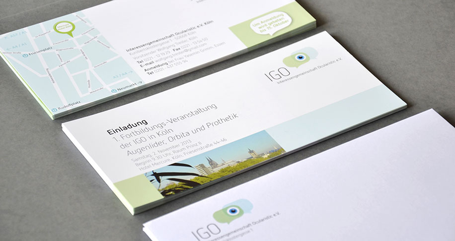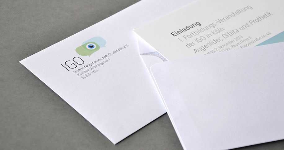 Für den IGO – Interessengemeinschaft Ocularistic e.V. entwickelte das Gestaltungsbüro Einladungskarten und passende Umschläge zur ersten Fortbildungs-Veranstaltung zum Thema „Augenlider, Orbita und Prothetik". Klare Linien und ein reduziertes Design bestimmen das Layout.